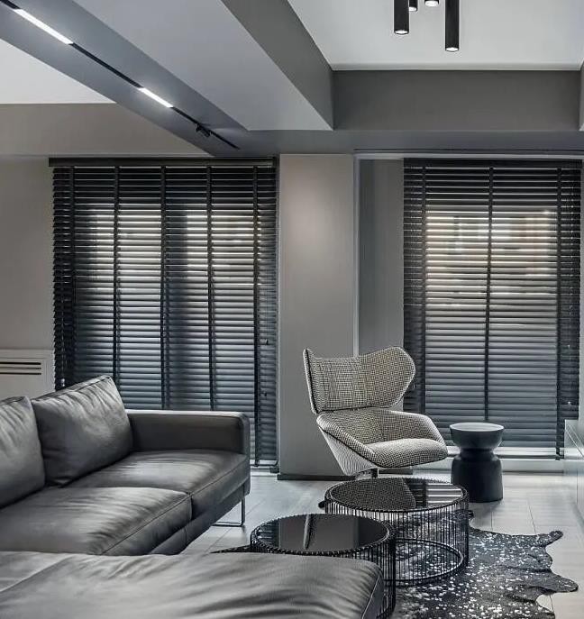 黑色百叶窗透露几点颜色,沉稳皮质沙发搭配创意十足的鸟笼茶几,大气十足