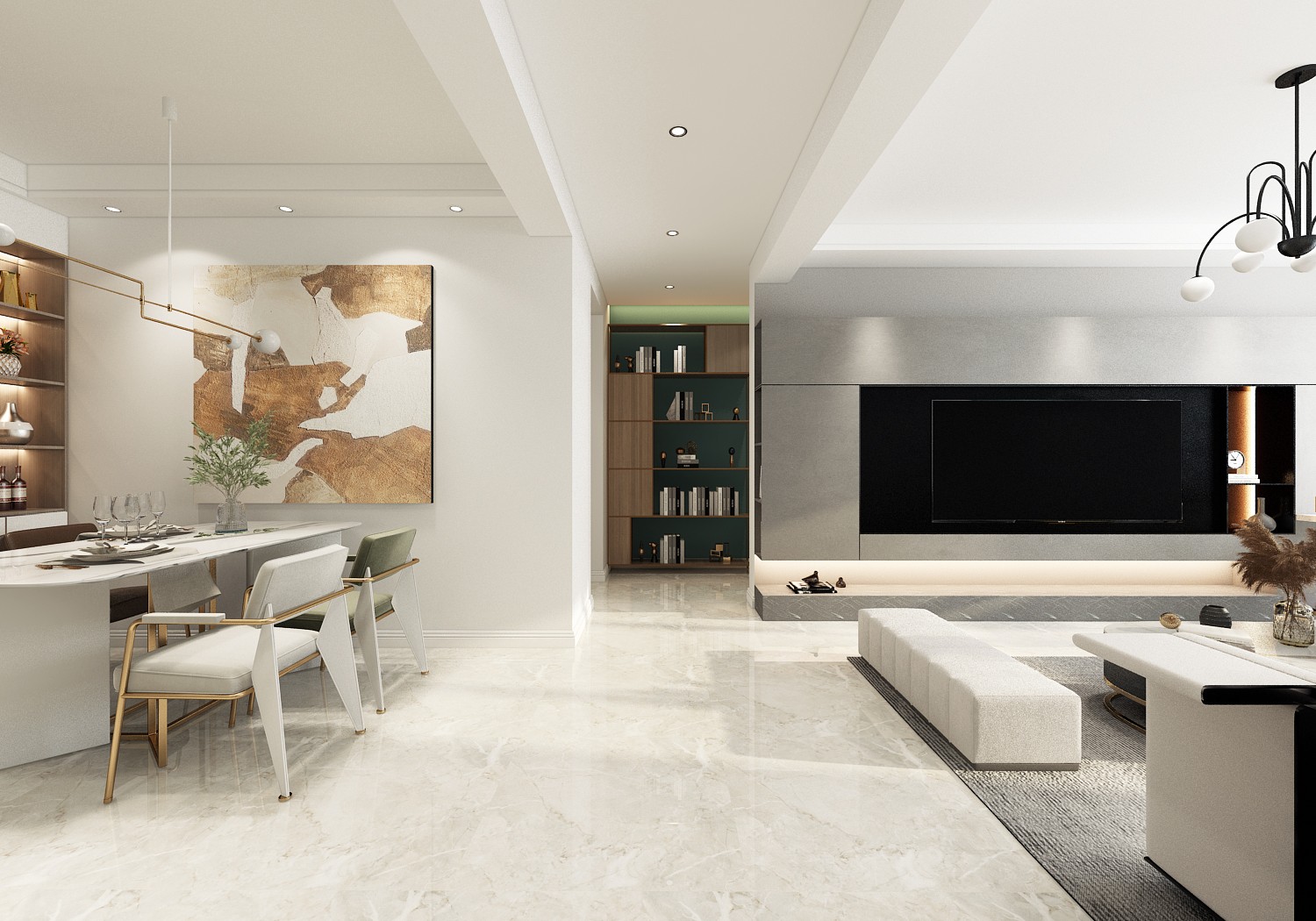 这是室内一个基本格局,客餐厅依过道隔开,室内色系偏向于清新、稳重风的搭配,没有暗淡,也没有浅淡,挺大气的感觉。