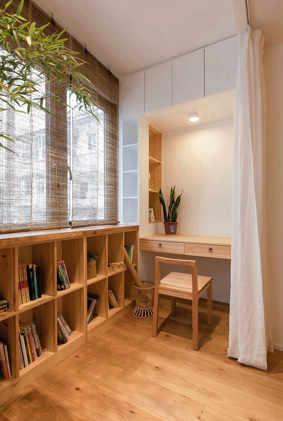 原本“房间—走廊—房间”的模式,被彻底打破。“阳台—主卧—客厅—餐厅—次卧”,空间沿进深方向层层展开,一条视线通廊贯穿全屋。原本封闭的空间关系被细腻的分隔成五个层次,层层展开,彼此之间连而不断。家,被一眼望穿。小房子,自然就显得大了些。