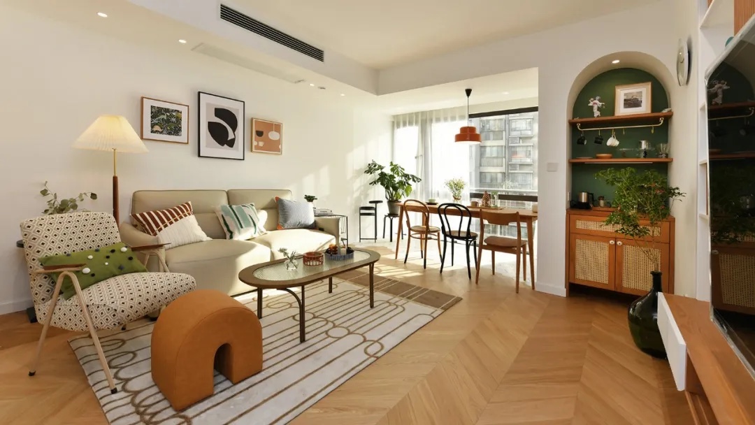 因为厨房格局较小,所以体积庞大的双开门冰箱被安置在外部的定制柜内,平日里在客厅休息时取用放置也很方便。