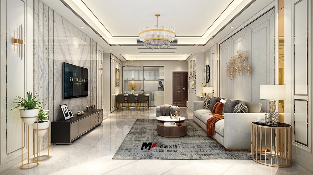 本案为轻奢风,业主喜欢暖色调。整体以米黄色为基调,搭配白色护墙板、大理石、茶色镜、布艺沙发、轻奢吊灯、暖白色灯光设计,营造出一个温馨舒适的居家环境。