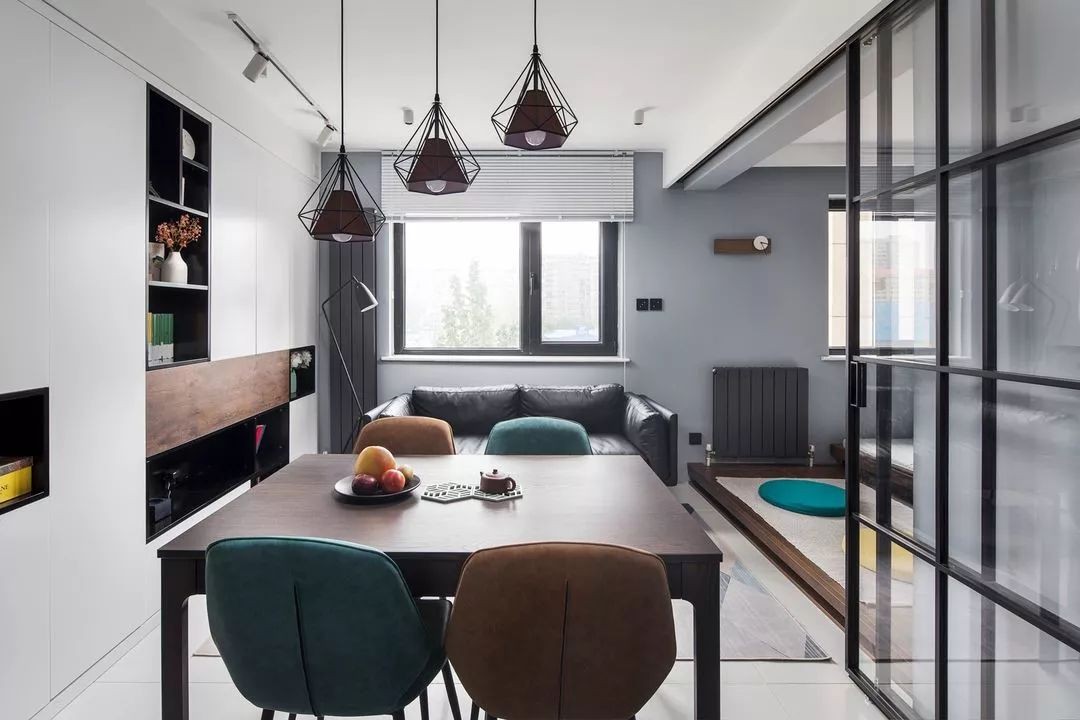 针对次卧面积不足7平米,客厅空间面积偏小的问题,将次卧改为「半开放卧室」,卧室与客厅之间用玻璃推拉门分隔,相互借用空间,两个空间的通透性均得到改善
