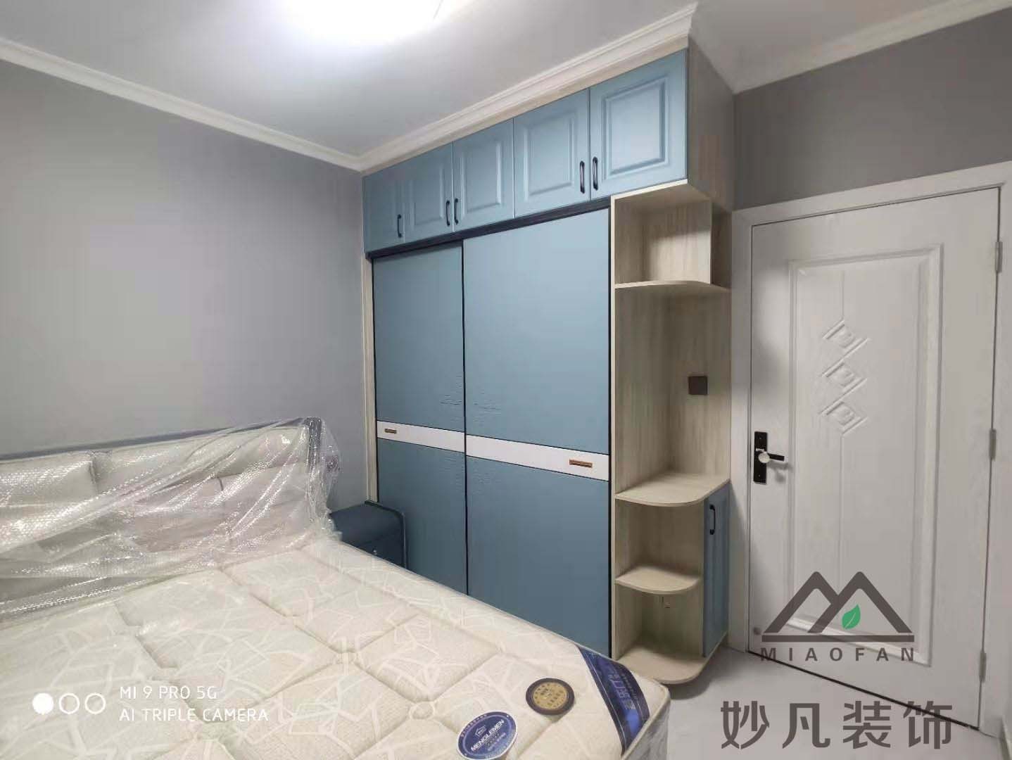 该户型是大两室,业主喜欢蓝色,从硬装到全屋定制柜子等等领包入住一共7万(带地暖)。