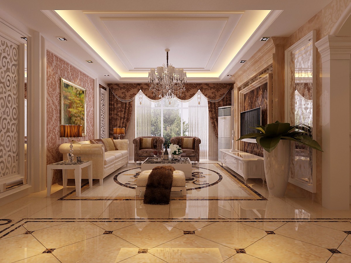 电视背景墙的石材与线条结合,石材的罗马柱增加了家居的高大上