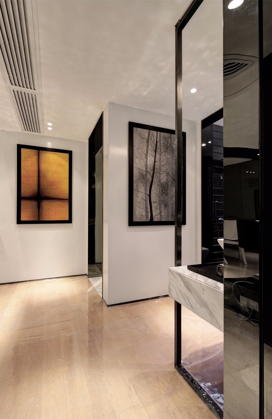 色彩上以经典的灰、白、黑穿插交合配色,同时通过镜面的反射增添了空间的一丝趣味.营造设计感,提升空间的使用价值.