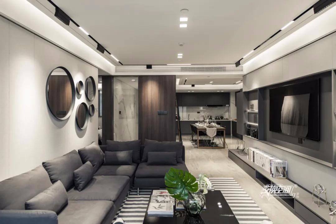 黑白灰冷色调中融入温暖的木饰面与实木餐桌,瞬间打破空间的冷意,为用餐厨空间凭添烟火气息。