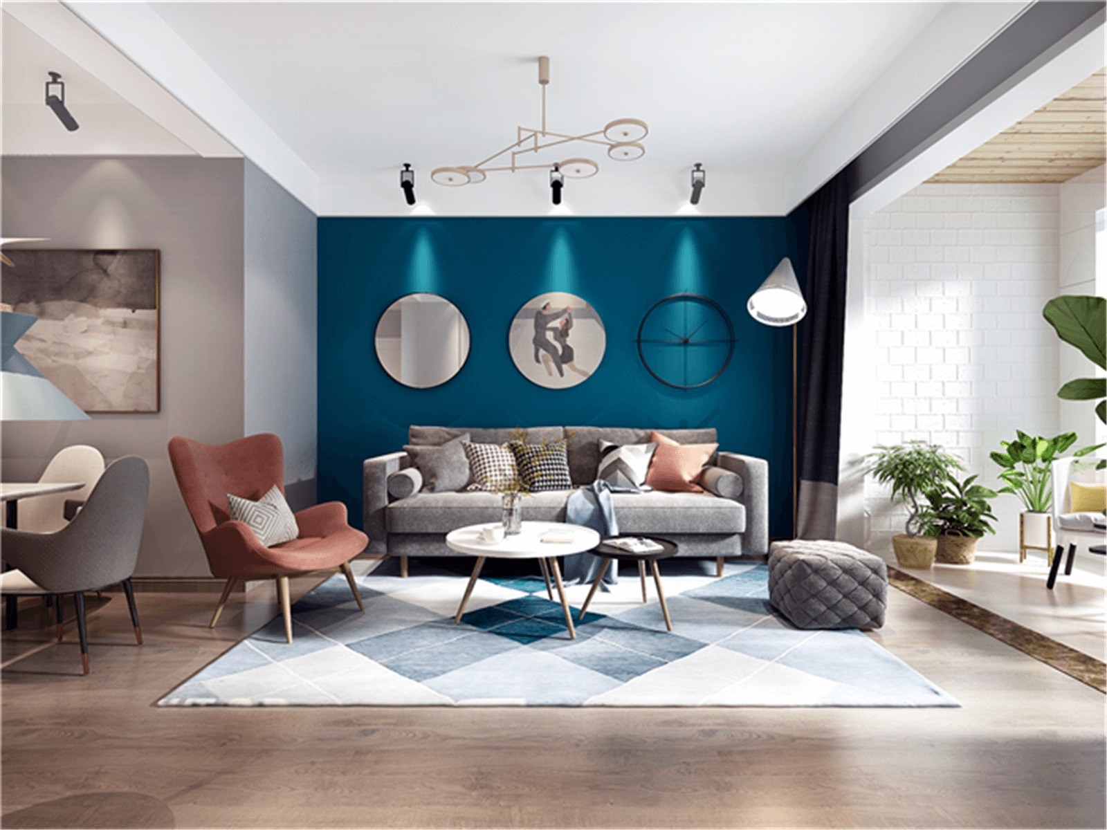 客厅整体以蓝色为主,橙色为点缀。沙发采用浅灰色,美观又实用,背景墙的装饰采用北欧风的挂画,茶几也是时尚感满满。