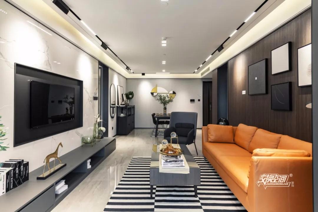 在黑白灰空间里,高明度和纯度的爱马仕橙矮背皮沙发跃然而出,充满活力,冲散了黑白灰的冷意,多了几分温馨与休闲的感觉。