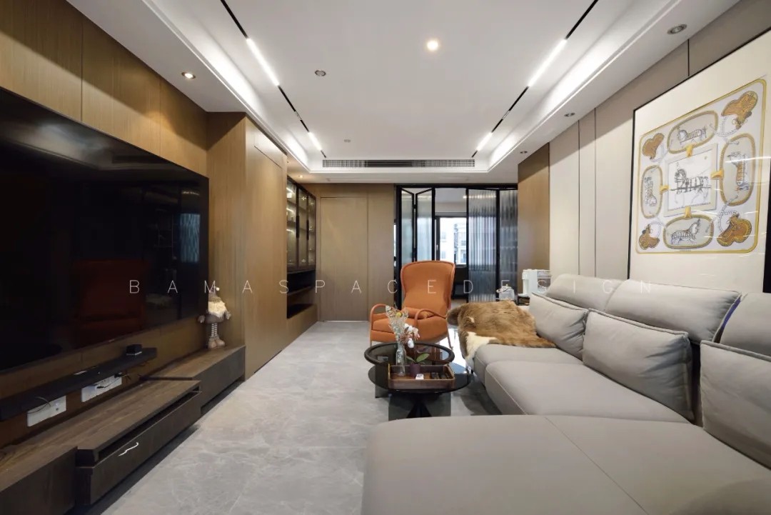 客厅选择浅灰色的地砖搭配木饰面,增加壁炉元素,无主灯吊灯加上磁吸轨道灯,让整个家更显精致高端。