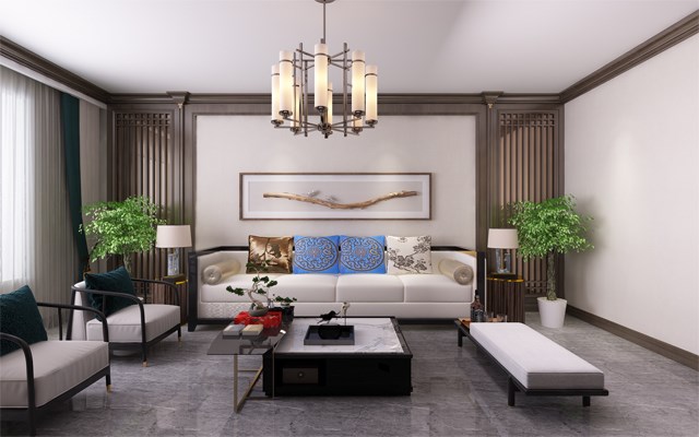 客餐厅打破传统的中式风格必须做吊顶的要求,使用胡桃色造型线,不仅没有压制房高,反而新中式风格体现的更加尽致。