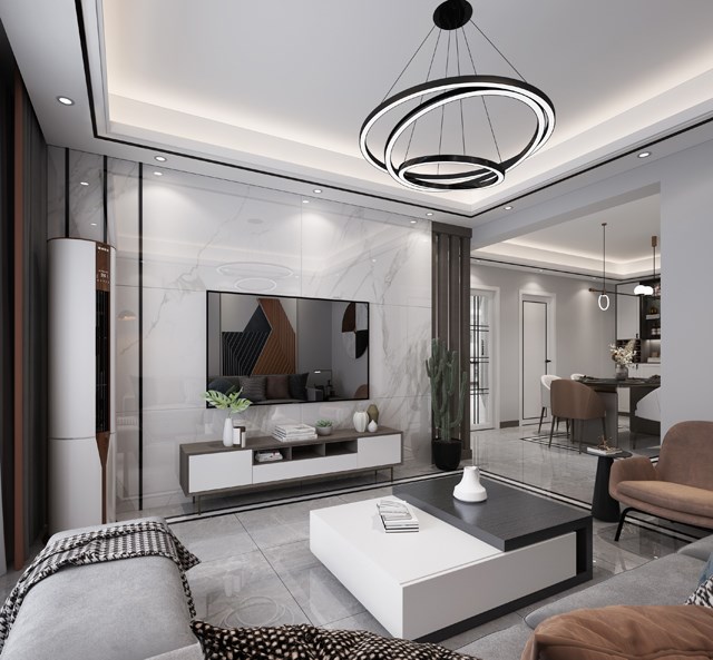 电视背景墙采用瓷砖大板上墙,兼具性价比与高颜值。