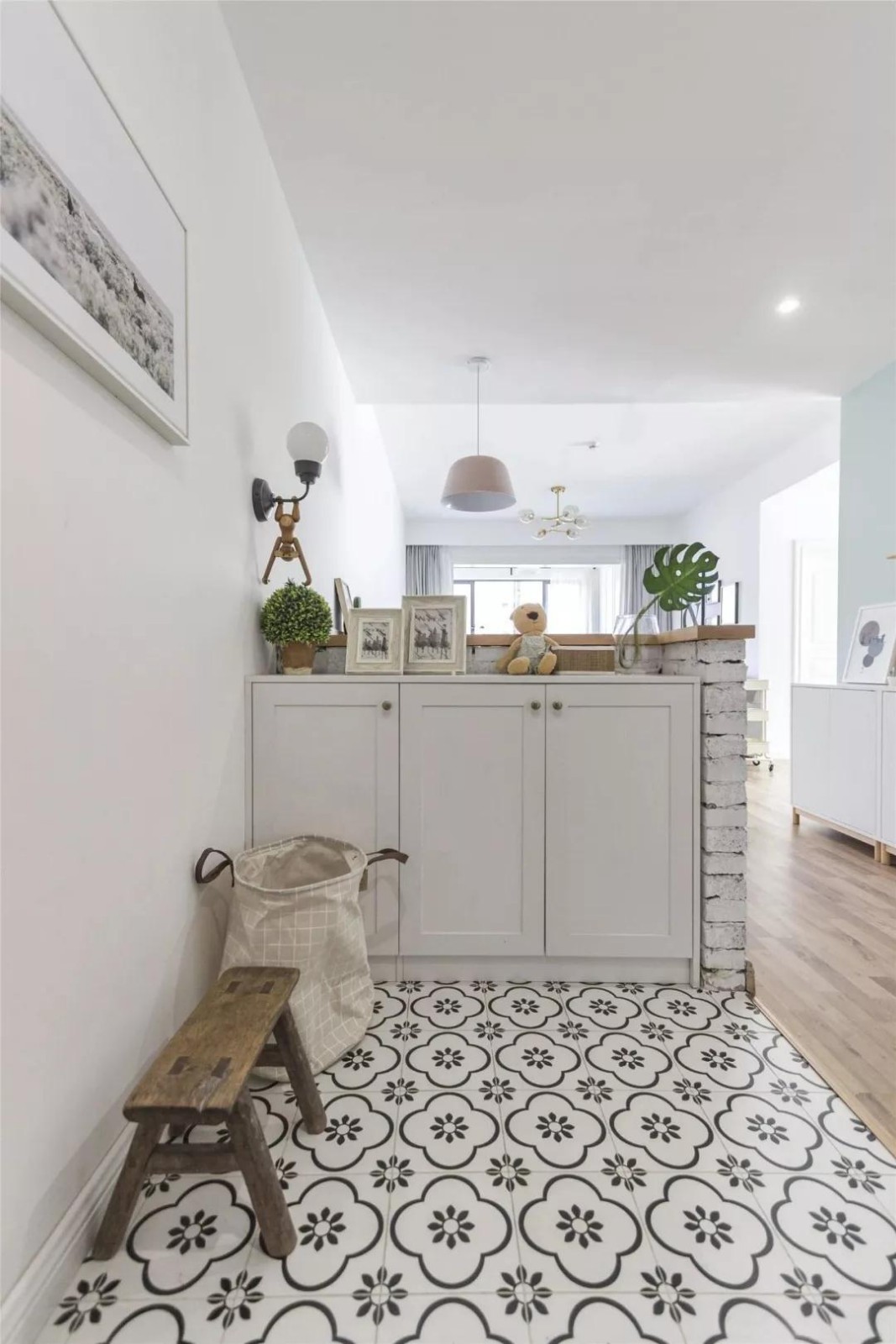 入户没有玄关走廊的户型,设计师在玄关门厅加上了半墙和柜子作为隔断,玄关地面铺贴花砖,一个复古的长板凳增添文艺感。