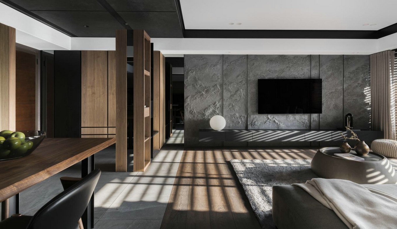 黑色吊顶,白色吊顶,灰色混凝土,木地板四种材质灵活运用了黑色,白色,灰色,木色。四色和谐,区别出公共空间与私人空间。