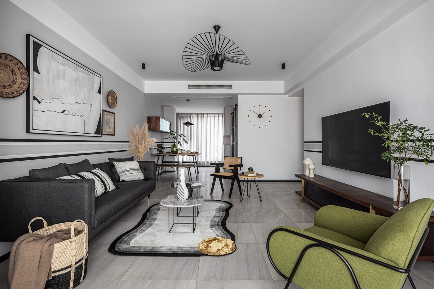根据动线流畅上的考量,餐厅与客厅在同一空间,定制的餐厅柜与木纹肌理感的饭桌,整体感与环境完全相融,一切都呈现出与自然的和谐平衡