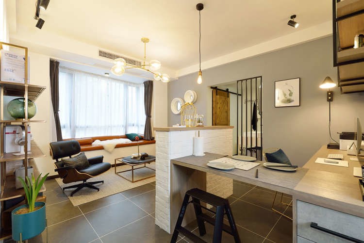 只有一个厅,需要集合客厅、餐厅、工作区三项功能。现场制作吧台,向一边延伸出书桌,另一边砌了一道矮墙作为电视墙。