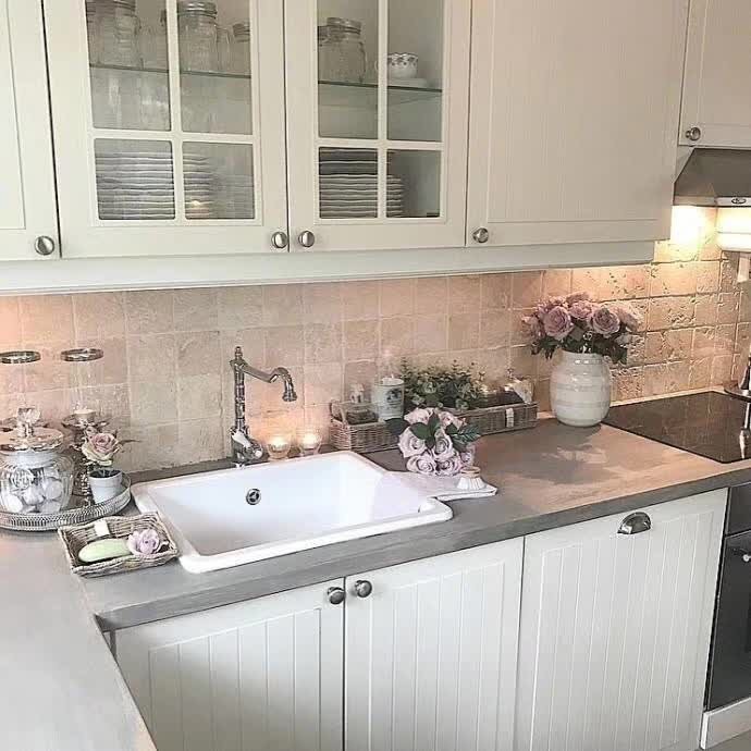 白色厨柜加上陶瓷水槽,配上艺术术砖,把灰色的台面烘托的更加高大上