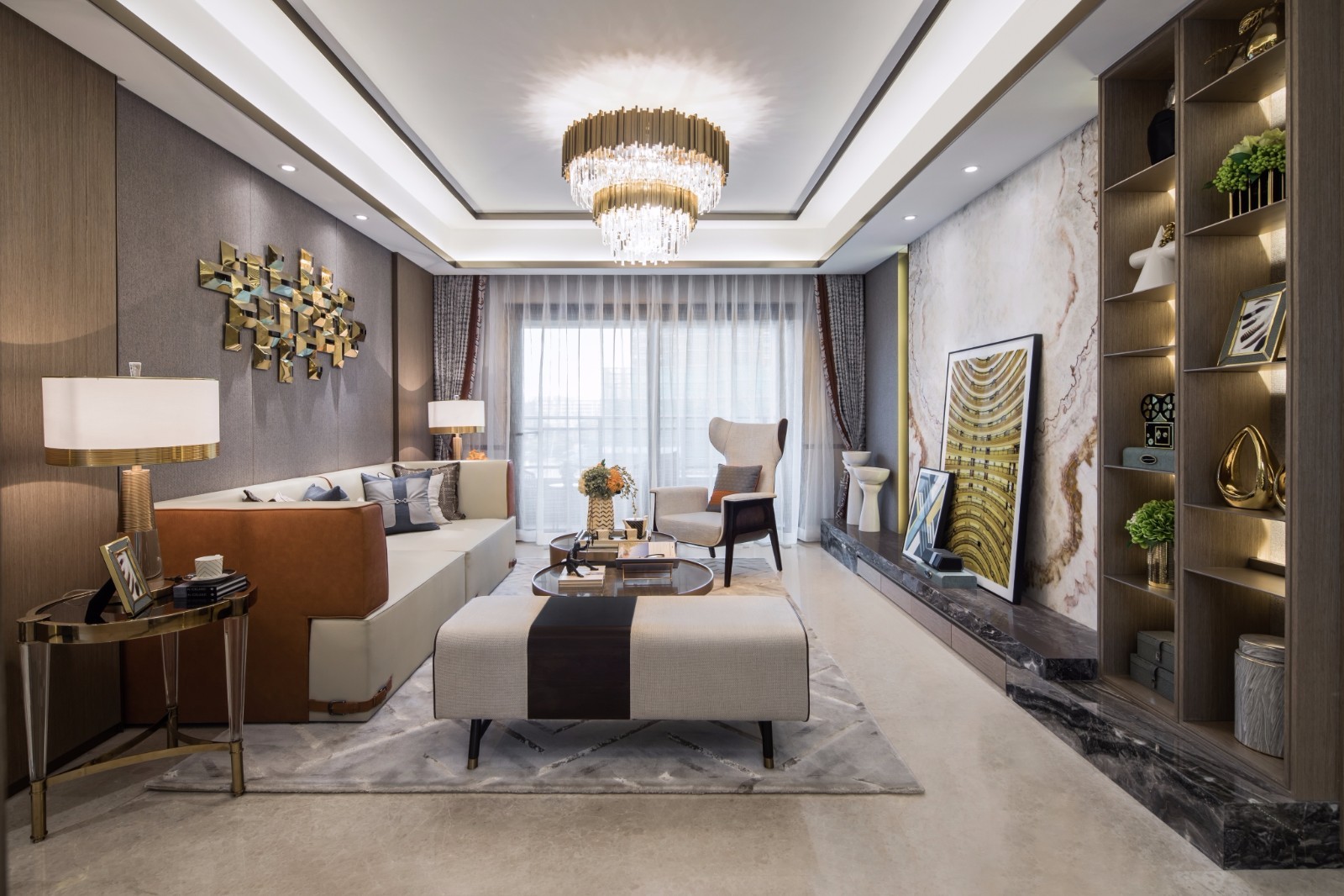 客厅中的金属色总能营造出港式的时尚与璀璨,拉丝黄铜不锈钢材质经过抛光处理散发出强烈的金属质感,让整体空间重现大都市的摩登时尚