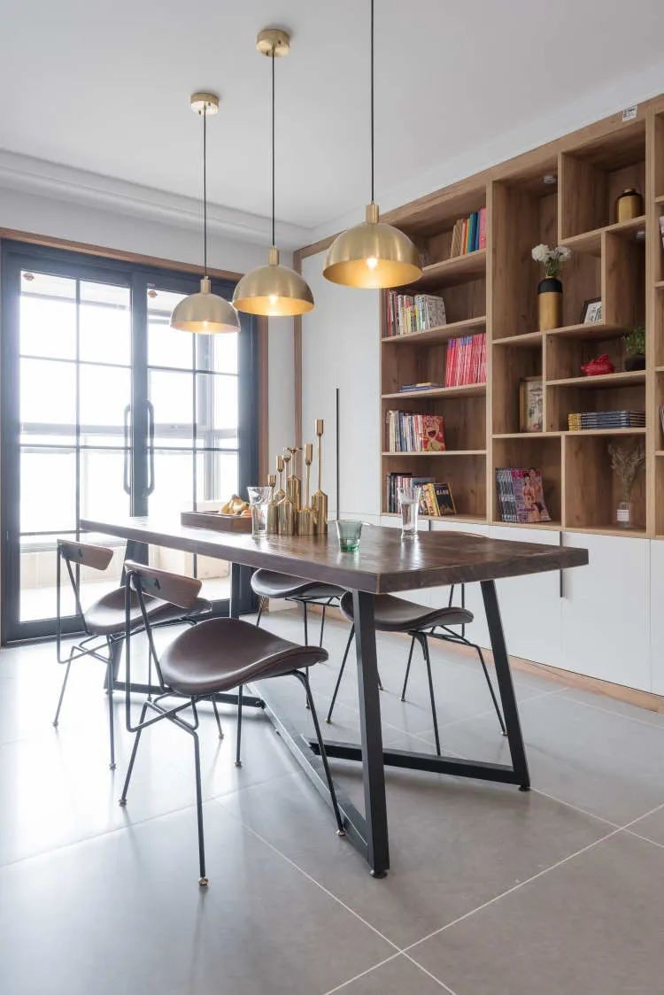 入户、西厨、餐厅和生活阳台形成串联,动线流畅空间更加宽敞通透。简易造型的桌椅,占用面积少空间更通透,木质与金属质感的结合,稳重又大气。餐边柜封闭式与开放式结合,增加了空间趣味性,避免设计呆板。