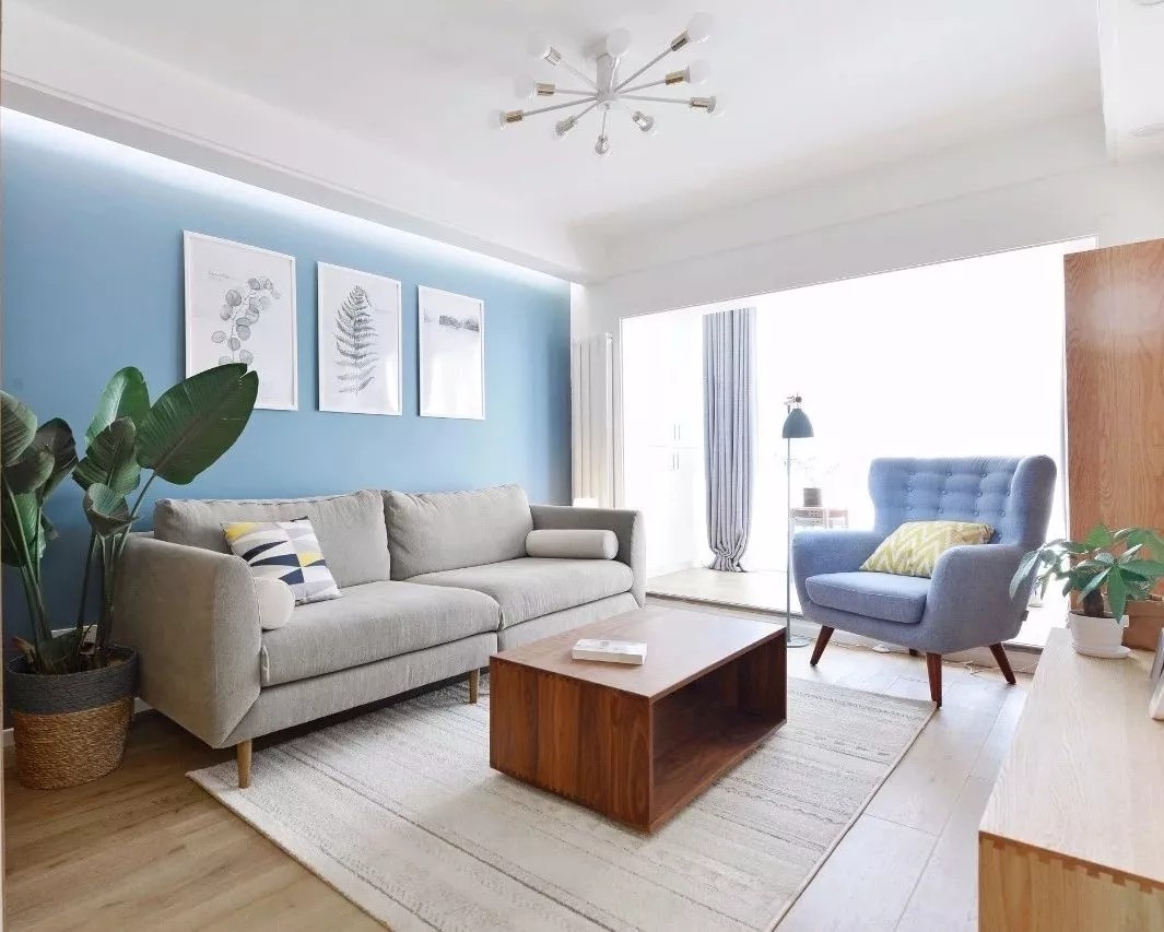 走过餐厅之后就到了客厅空间,浅蓝色的背景墙搭配上相近色彩的单椅,起到相互呼应的作用。在原木色的主体空间内有了这样一抹跳跃的色彩,看起来更舒服一些