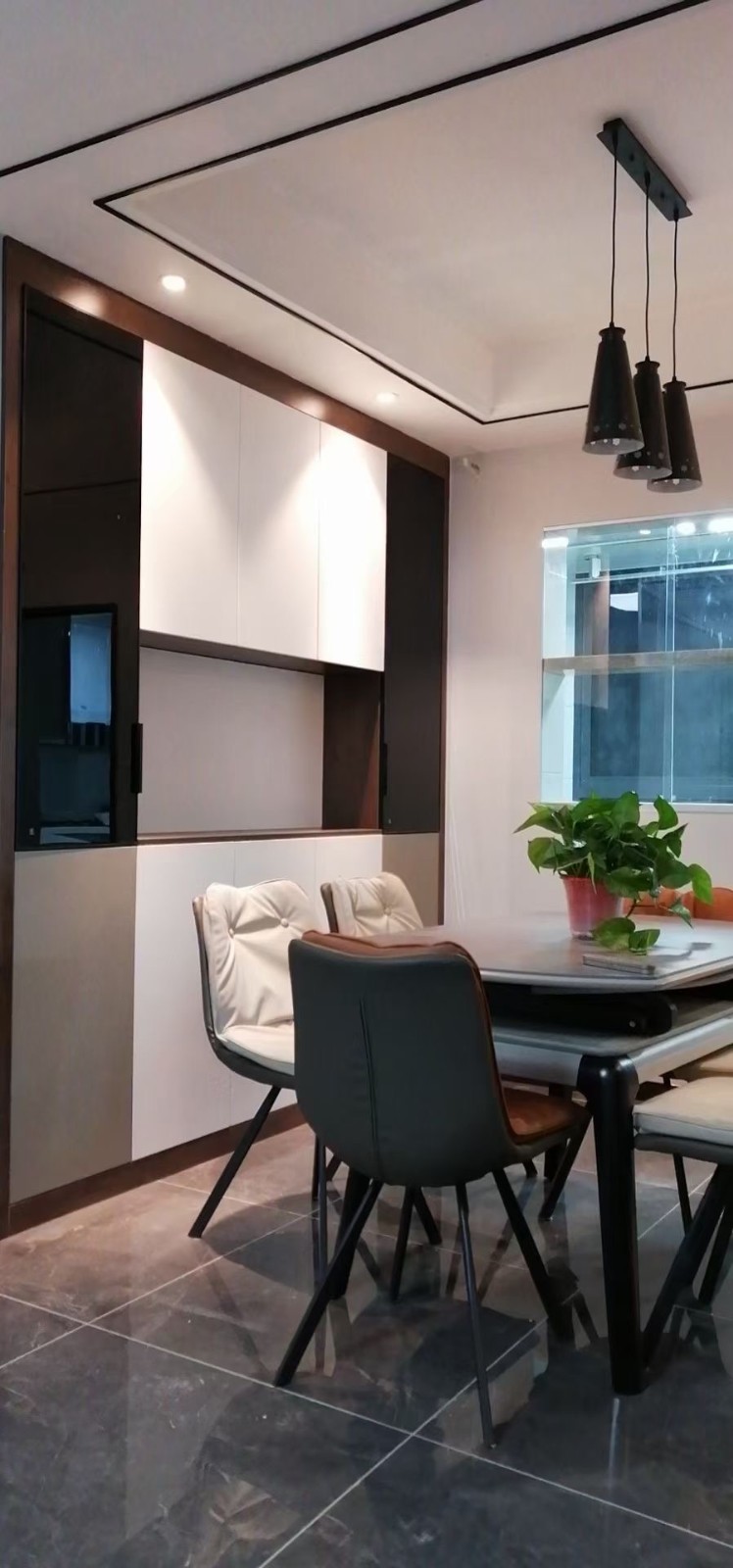 餐厅的酒柜柜门做了撞色,无拉手做的反弹器,看起来简约又方便清洁