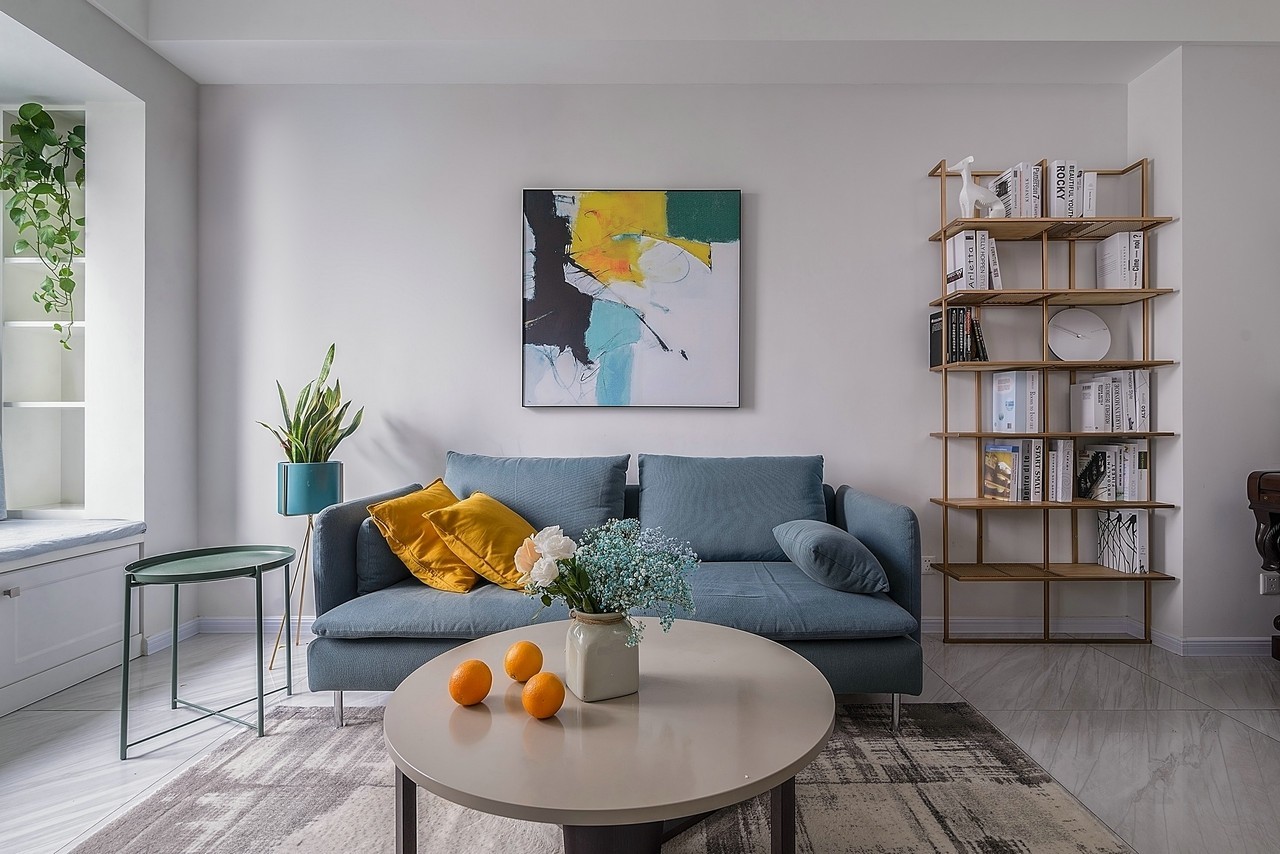 客厅采用简约的表现手法来展示,墙面用白色涂料进行涂刷,在挂置上简约时尚的装饰品来点缀空间,营造出一个看似简单但并不简单的空间。