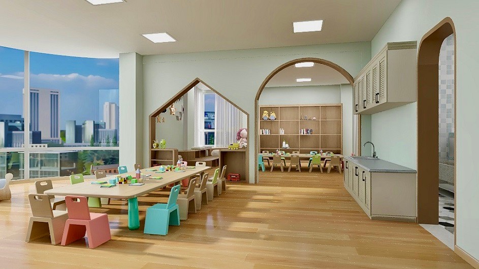 孩子天真活泼,喜欢高纯度、鲜艳、对比强烈的色彩。所以教室采用浅绿色为主,色彩缤纷能够使孩子们受到心理上积极的暗示作用,变得比较兴奋,求知欲望增强,活力四射,食欲也随之增加。不同功能的活动用房,颜色搭配也不同。