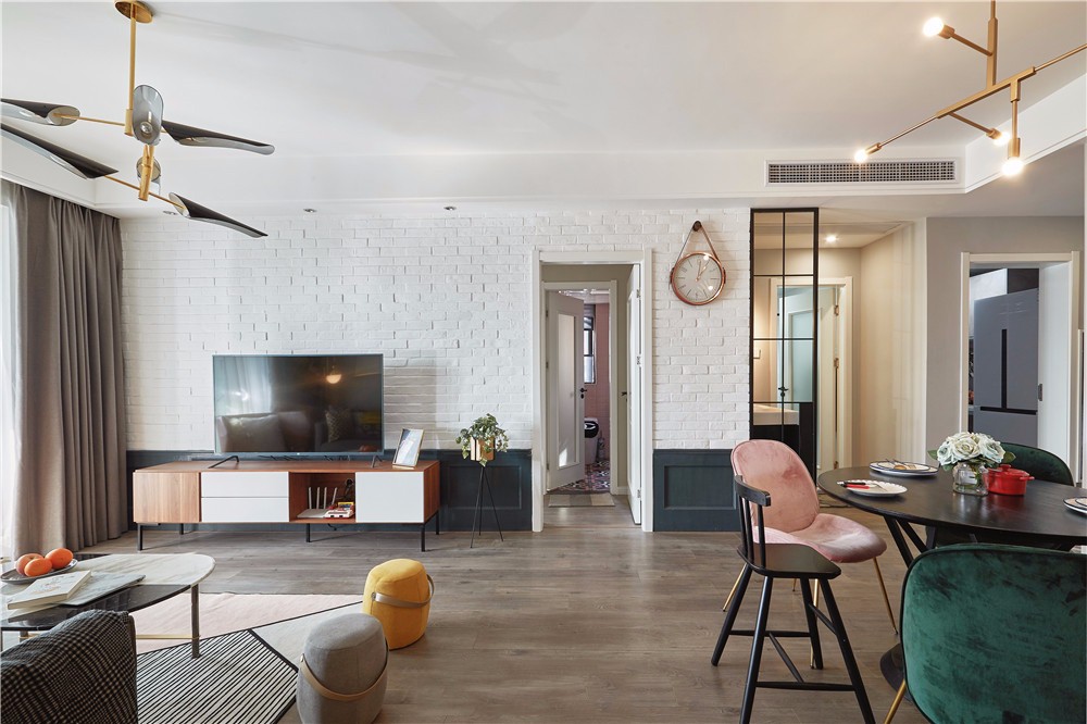 入户玄关贯穿客厅、餐厅,以小过道来做为客餐厅的分割点。在视觉上,空间上,整体性特别协调。