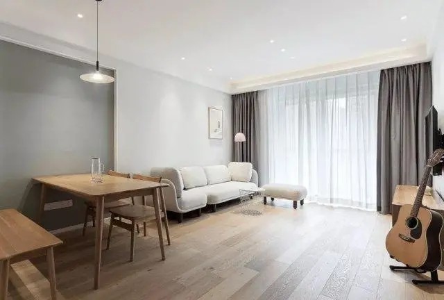 电视墙也选择了白色为主调,以原木风的电视柜作为搭配,简洁中不失美感,整体以木地板铺设,触感温润又自然,代表着生活,安静又闲适