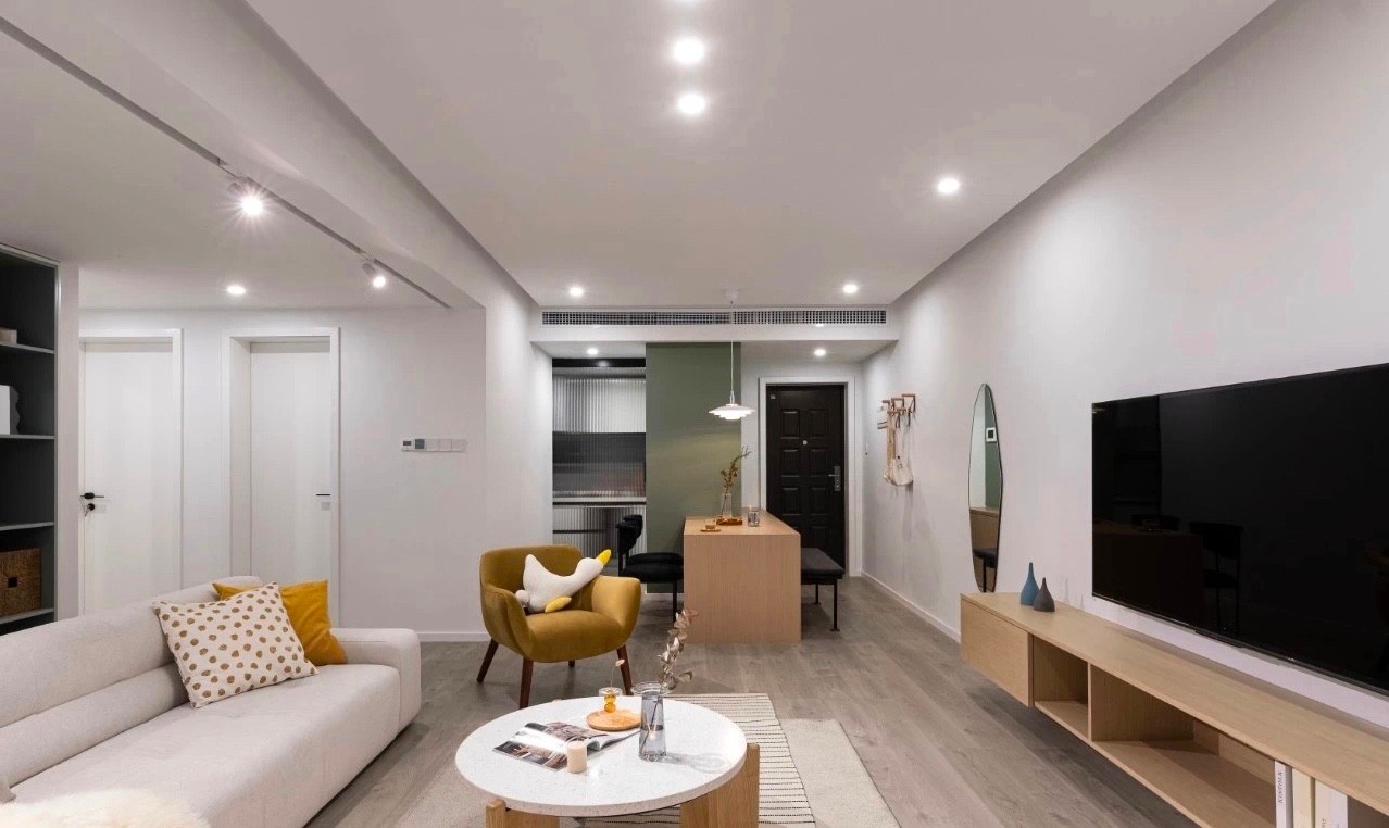 整屋色调以白和木色为主,豆绿为辅,搭配一些触感柔和面料的软装中和墙体带来的硬朗感。