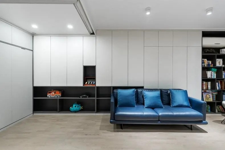 增加了一个收纳床,平时折叠起来,用时直接打开,客厅面积够大,简单打造小次卧,满足朋友留宿的需求