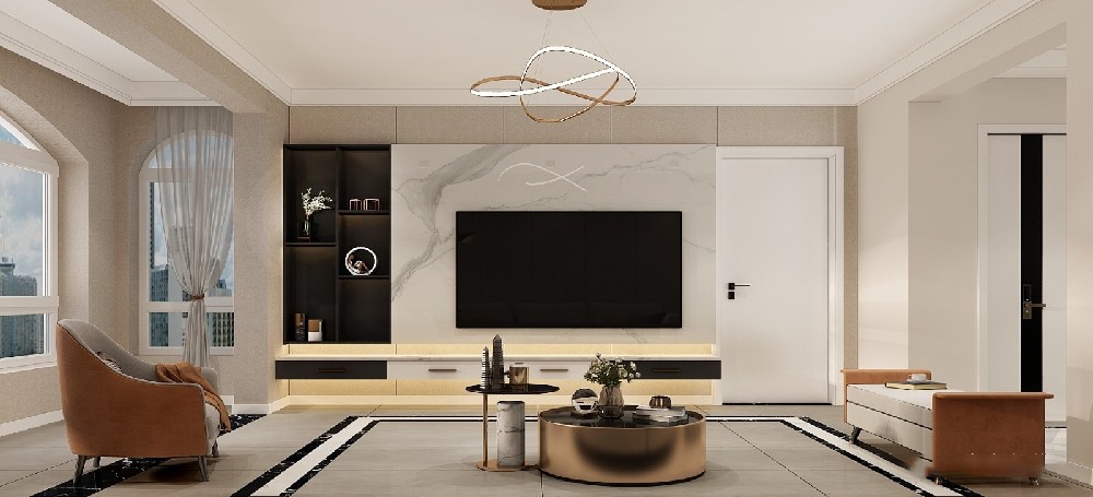 客厅以白色为主,以黑色、金属色为辅,十分的和谐,简约不失大气。大面积的落地窗带来了充足的光线,让客厅看起来更加明亮舒适。