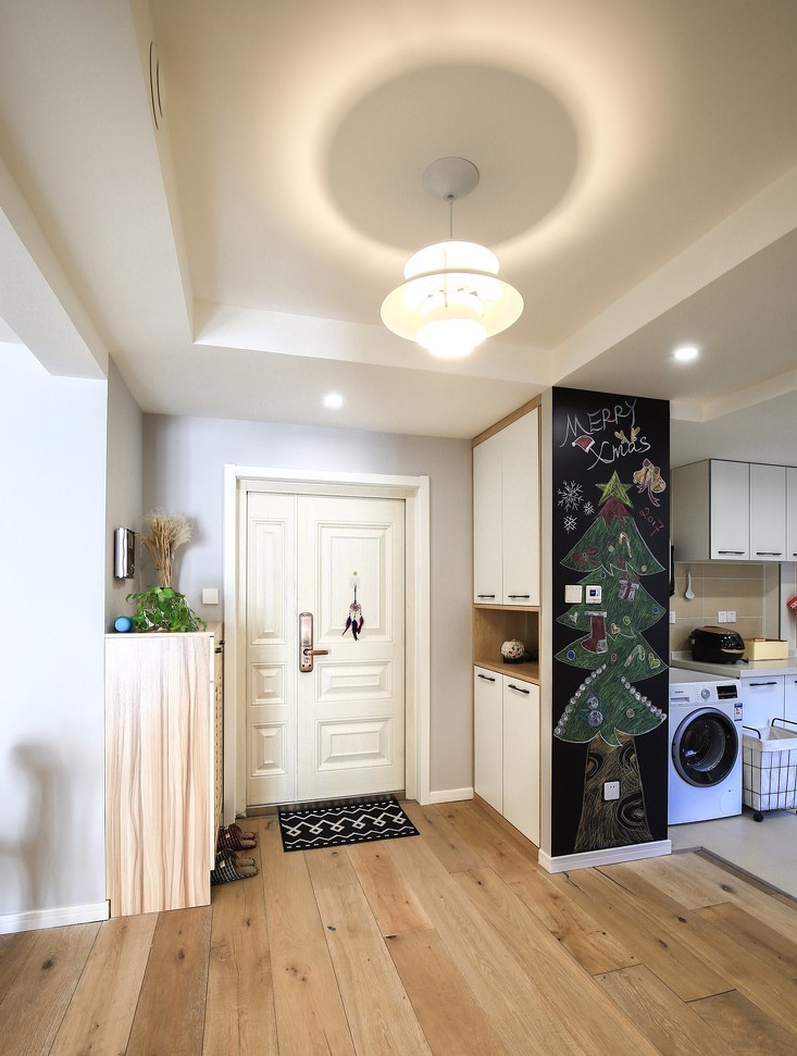 玄关大面积白色搭配原木,让这个小空间温馨又通透。橱柜是储物主力军,空间分割,刷上很火的黑板墙,两个人的生活又增添了很多乐趣