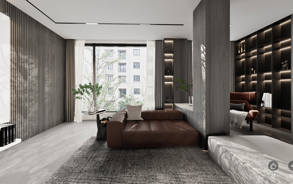 客厅客厅空间配色主要以沉稳大气为着眼点,在黑白灰色主色调的基础上增加深卡其色和奶咖色使空间大气的同时不失灵动感,以及温馨。其次功能区域的合理安排,把阳台区域规划到客厅使空间感无限延伸,给人以开阔的视觉感受。空间的色彩。