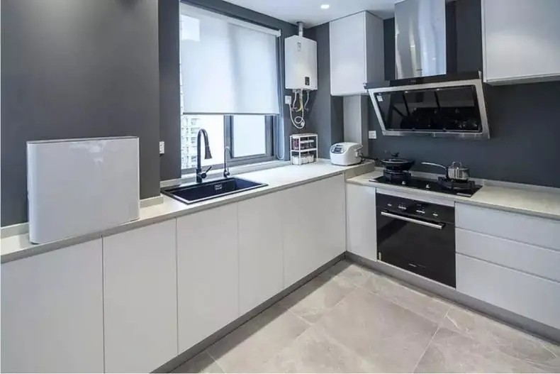 各种橱柜设计,增加了不少收纳空间,同时墙面采用了防水漆,灰色也显得大气低调,与白色作台很搭,高低台设计合理,很舒适。