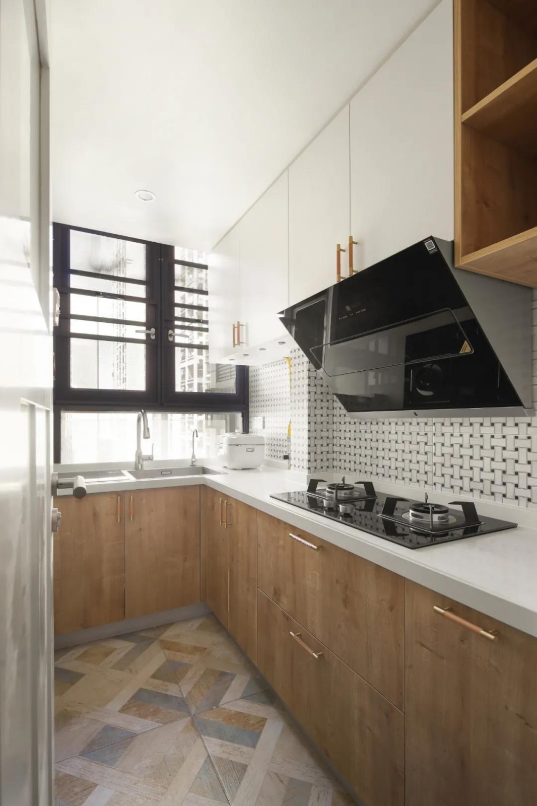 外扩阳台加上一部分原厨房空间,改为封闭式中厨,隔绝油烟。内部采用L型布局,实用性强。