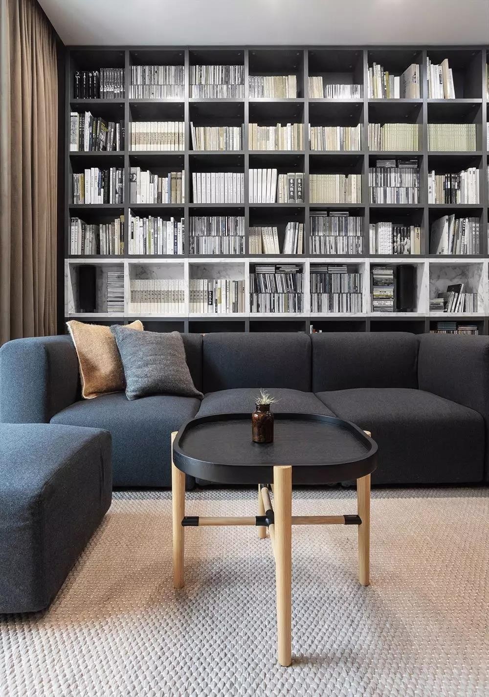 客厅选择MUJI 的单元沙发,由单元模块组成,可以根据需要的场景或习惯的休息姿势,自由组合,灵活多变。可配合阅读、影音、朋友聚会不同场景,还可变身沙发床,实现多种可能性。书架背景墙可以通过拉上整幅的窗帘,立刻让客厅变身影音室,或安静的阅读空间。