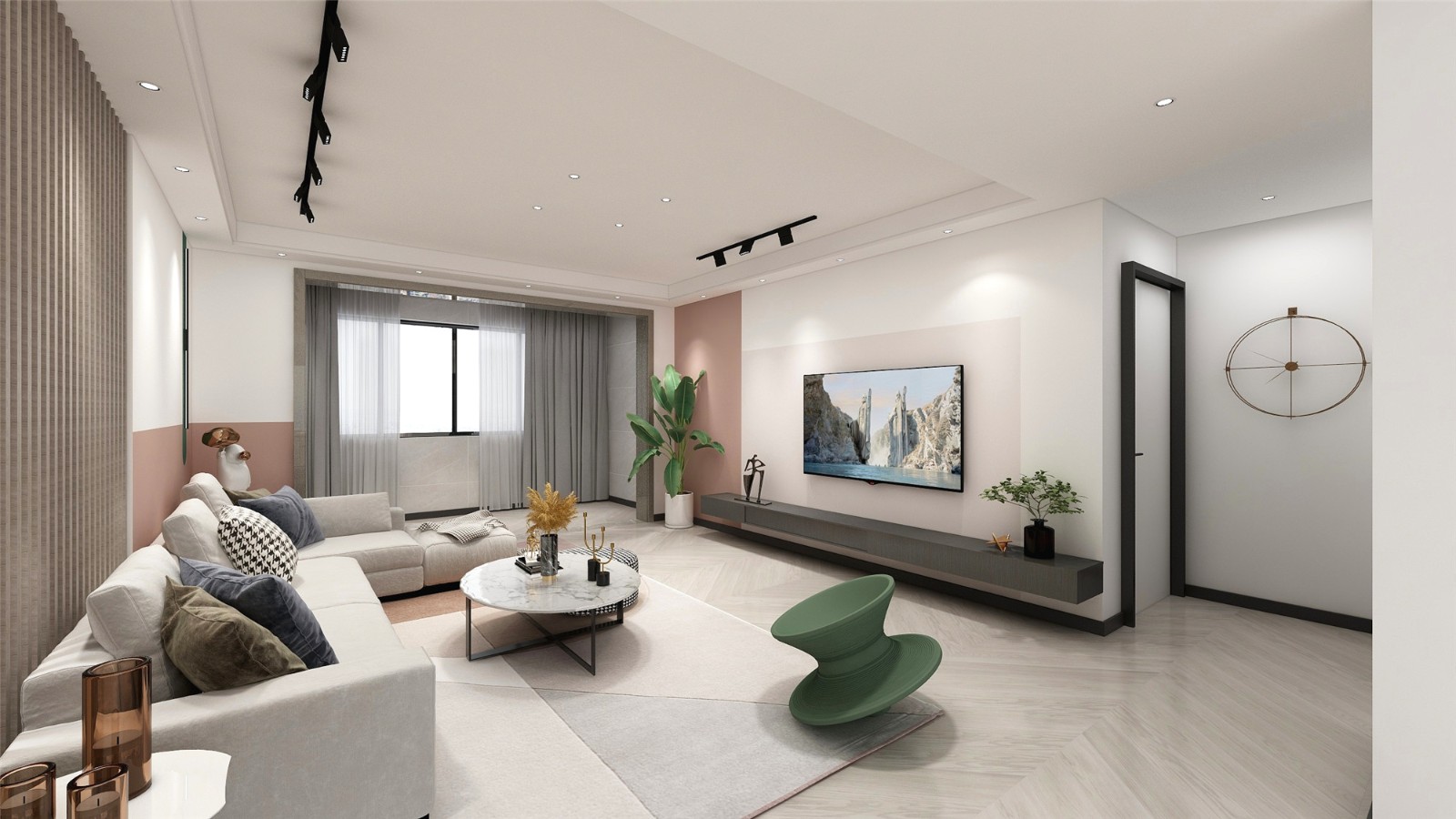 客厅背景墙采用粉白撞色,复合现代年轻人的审美,同时起到给空间提亮的效果