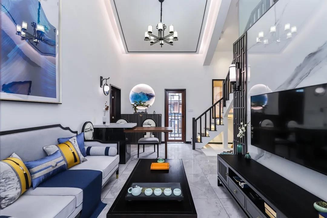 电视墙左右以屏风造型,中间大面积的大理石质感,布置上黑色电视柜与茶几,雅韵的细节布置,让空间充满新中式的时尚与大气感