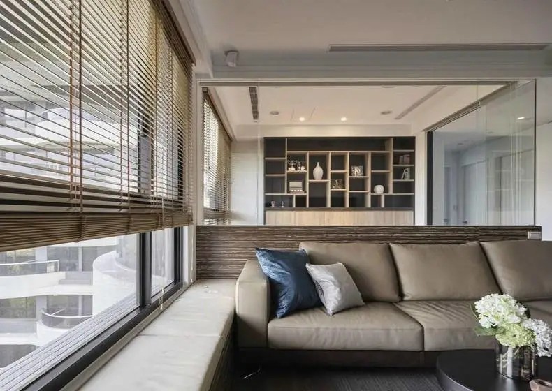 不浪费窗外的大片绿意,设计师特别打造了窗边卧榻,让屋主能够在美景陪伴下享受悠闲时光。旁边是同色系的布艺沙发,延长了客厅的待客空间,可以满足更多亲朋好友相聚于此。