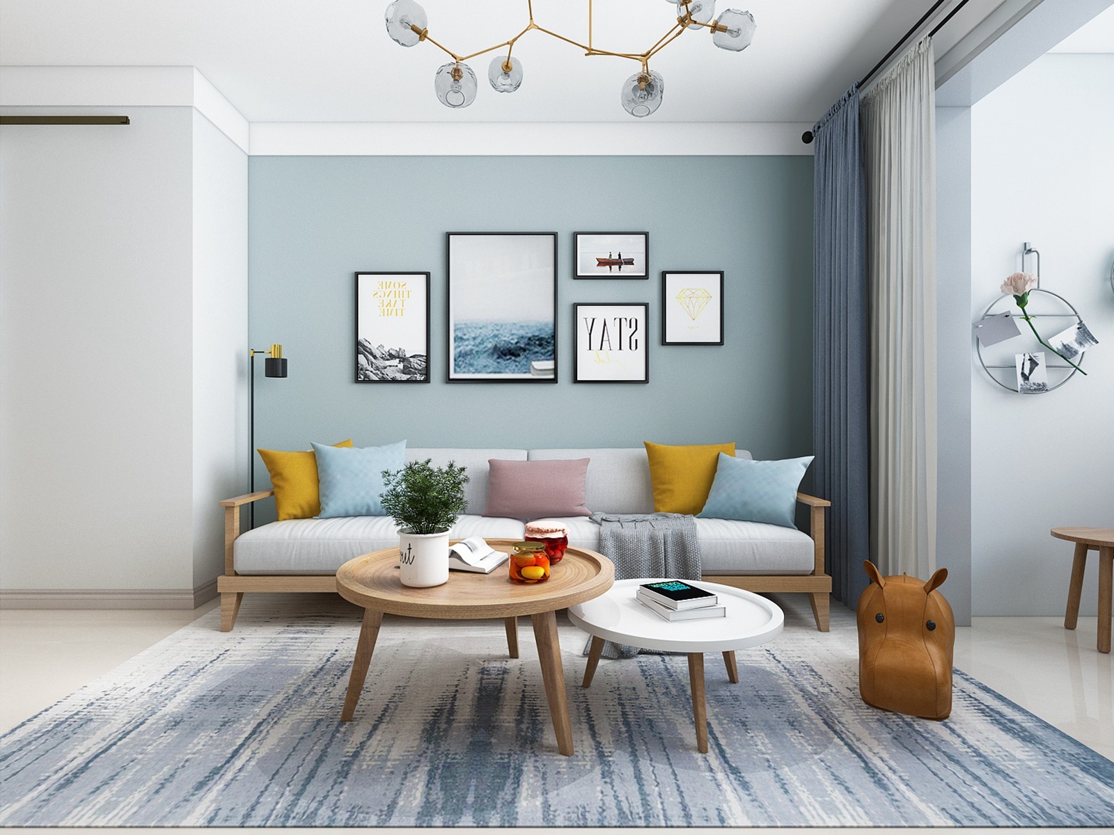 茶几采用高低茶几,一个是白色的一个是原木色的,非常有特点,也很符合客厅的整体调性。