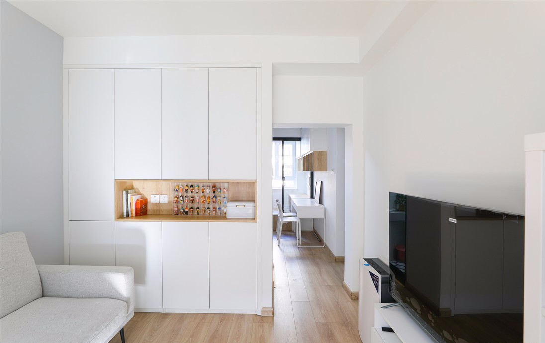 在入户进门处设计了整体玄关鞋柜,整体是白色中间是木色镂空,方便随手搁放物品,柜子底部空出高度用来临时放鞋,玄关的另一面柜紧挨厨房,把冰箱正好包容进去,同时中间设计了三个木色格子,里边正好可以放置些餐具酒杯。顶部的柜体里可以收纳物品。.jpg