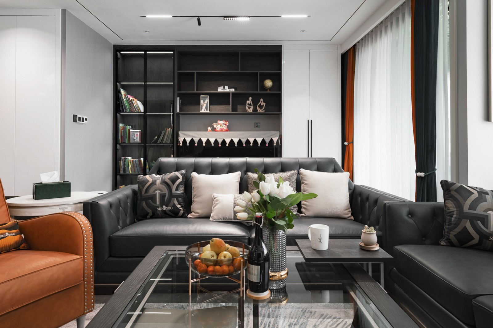 都市气质满满的真皮沙发,U型组合,黑橙配色,勾勒出空间的精致立体,也契合了客厅的内敛气质。