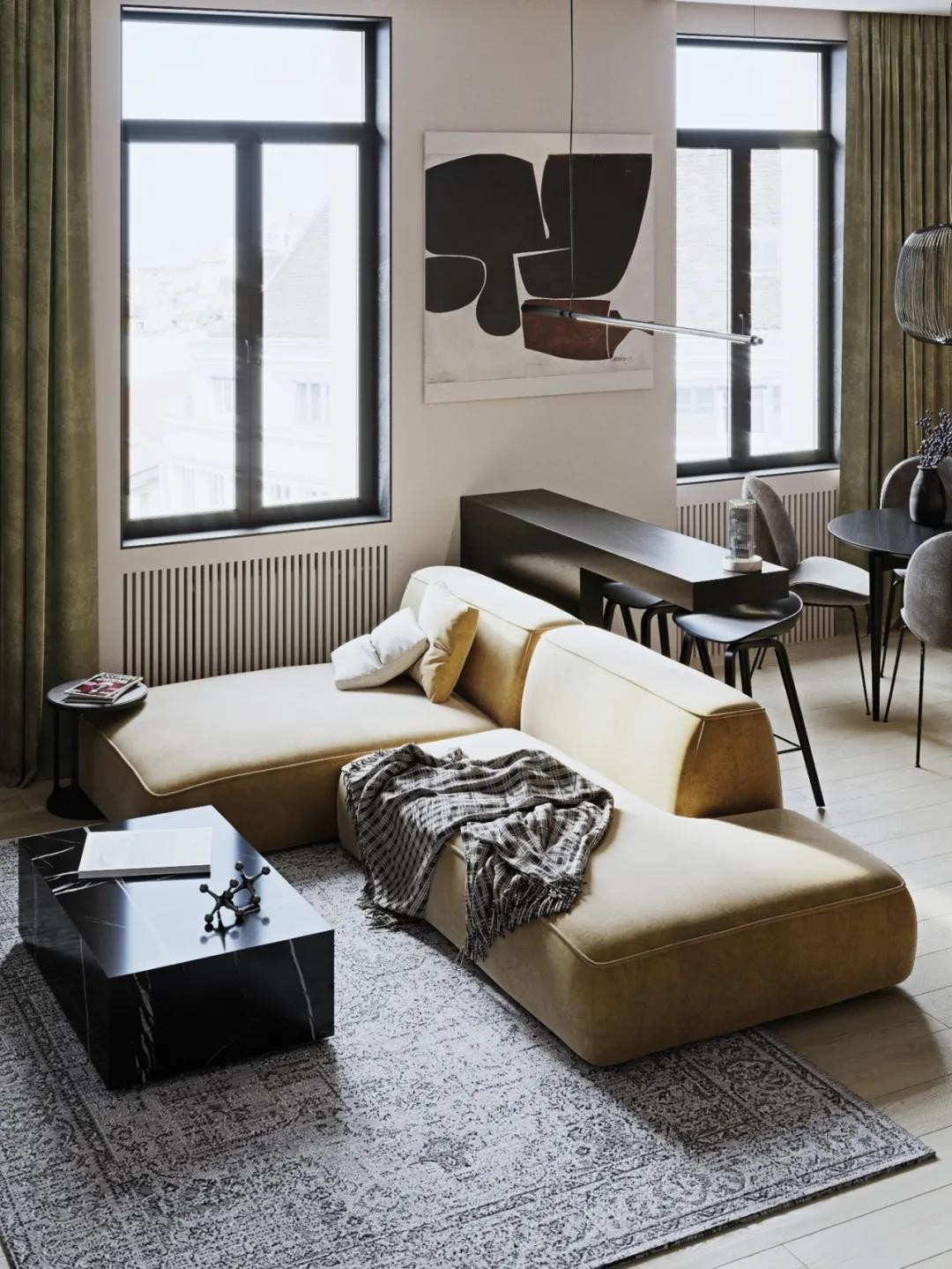 在黑白色的空间里,设计师选用了姜黄色的布艺沙发,明亮的色彩成为空间的焦点。
