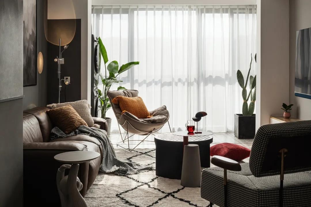 将阳台纳入客厅之后,空间面积从11.6m² 增至为16m²。利用素灰色作底,部分白色与之搭配,空间显得沉稳舒适。加入皮革棕、暖橙及胭脂红点缀,除了体现时尚质感与色彩张力外,也表现出富于个性化的童真乐趣。***再添入两株绿植提升整体柔和感。