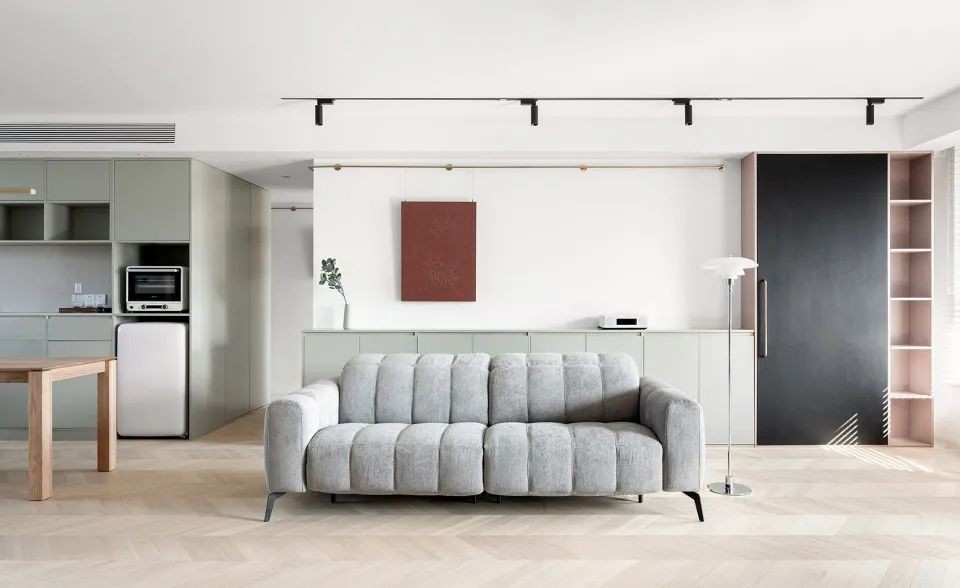 挂画杆沿着沙发背后的墙面转入过道,顺着墙面一直延伸到最内侧房间。打破了过道单调乏味的体验。整个过道区域也成为家庭画廊的一部分。