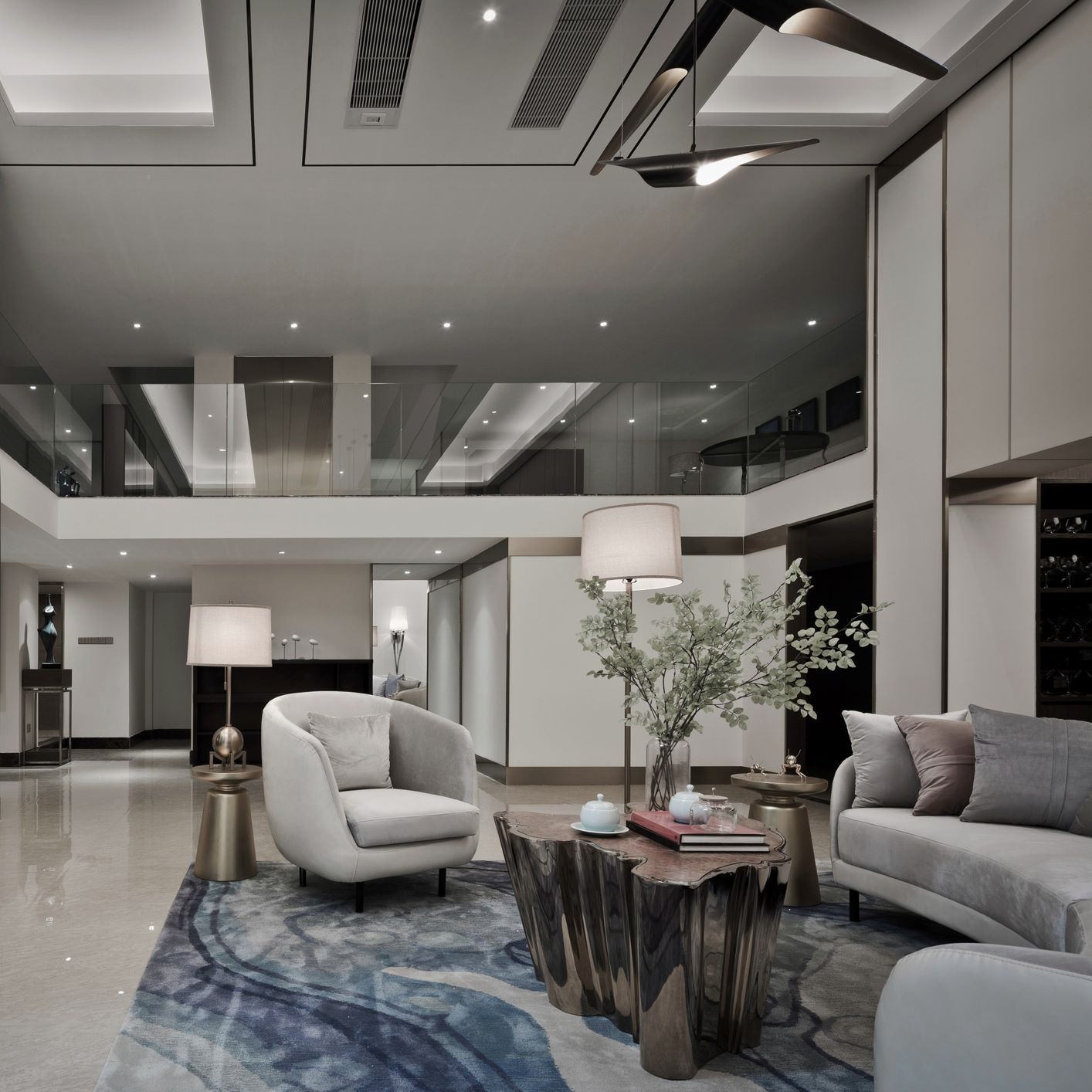 以润白为韵,在造型上却恣意变化,从不规则的茶几上便可见一斑。
