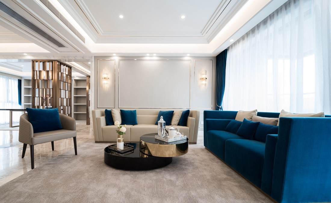 餐厅与客厅一体化的设计,距离足够拉长,琉璃的吊灯与麂皮质感的餐椅诠释了轻奢韵味,蓝色也激活了整个空间的生命力。
