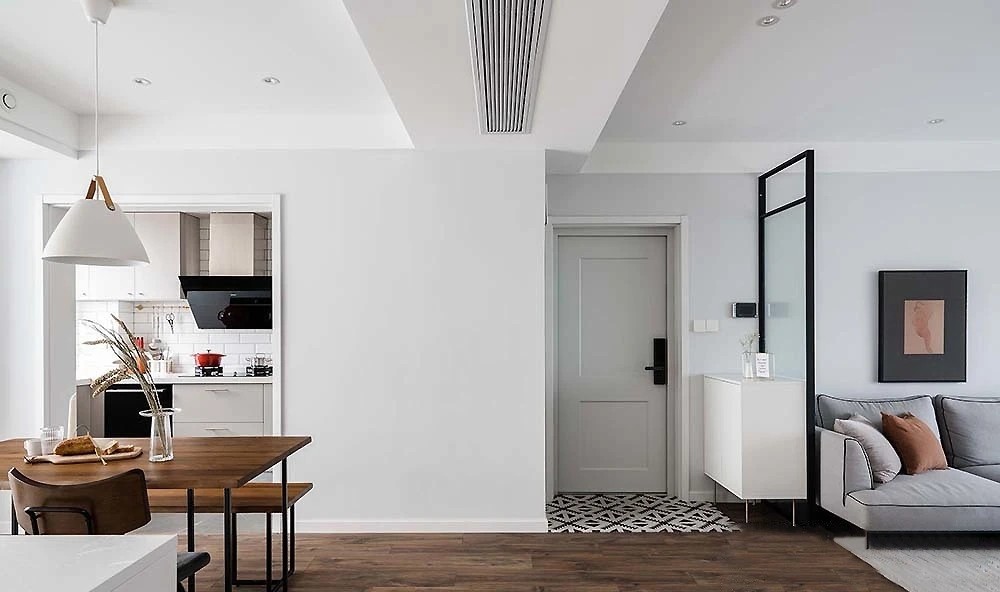 进门玄关处定制一片长虹玻璃隔断,加上鞋柜增加玄关换鞋区,避免了客厅一览无余