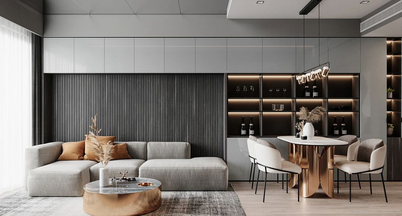 用简洁、硬朗的造型线条为一对年轻夫妇打造了属于他们的私人住宅,面积约为120㎡,整体氛围偏深色,金属元素的点缀让空间更为优雅和静谧。