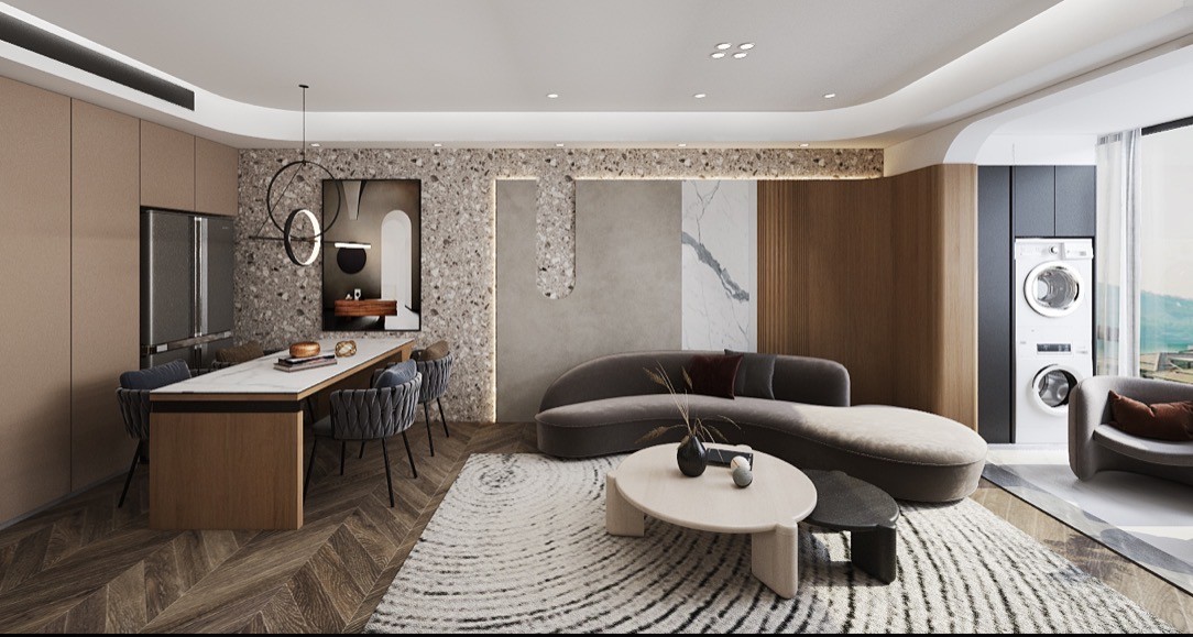 因为是直墙变 S 墙的关系 设计师在造型上重在突出块面感和流线性 将现代的精髓和优雅的调性相调和 沙发的形式既慵懒又舒适 墙上展示柜的色调也与之相呼应 做法上也别出心裁